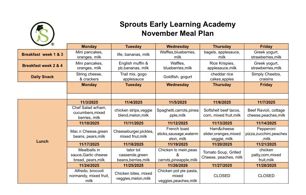 Proper health and nutrition are a cornerstone here at Sprouts. We believe that each child’s basic needs of proper nutrition and exercise must first be met before any learning is able to take place. Sprouts follows the CACFP (Child and Adult Care Food Program) to provide age-appropriate, nutritious meals, full of the necessary fruits and vegetables. We also encourage physical activity, which is foundational to creating healthy habits. Our meal plans are updated monthly on our website and are also be available on our parent portal.